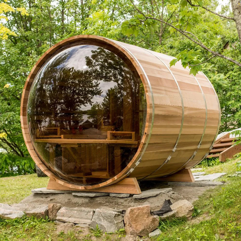 Experience superior engineering with our Panoramic Series backyard Barrel Saunas, designed for easy assembly and packed with innovative features. This modern sauna includes a sleek "dotless" white LED lighting system, controlled by a handheld remote for easy on/off and dimming options. Dual floor drains ensure efficient water drainage, making your sauna experience both luxurious and convenient.